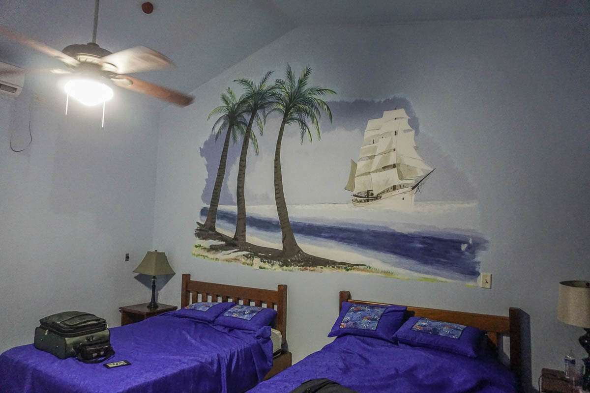 The rooms are nice and big. There are murals on the walls. The bathroom has two sinks, and one of the cold water faucets even works. Nobody will ever complain about the size of the shower.